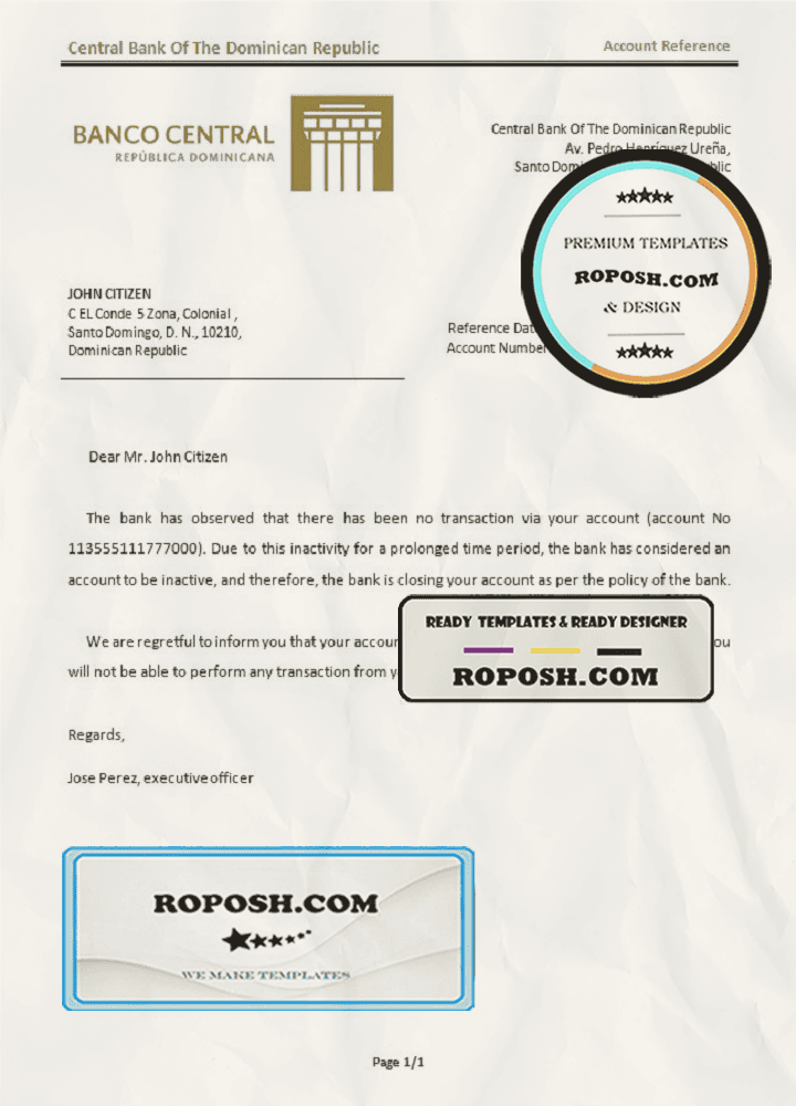 Dominica Central Bank Of The Dominican Republic bank account closure reference letter template in Word and PDF format