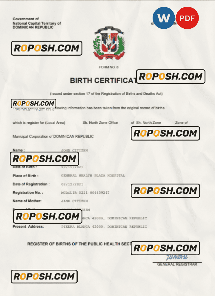 roposh offers hundreds of high-quality, realistic, and customizable birth certificates. The Dominican Republic birth certificate template is fully fillable, and you can complete it with any information you wish, such as name, surname, birth date, place of birth and etc. Whether you are using our PSD template (a layer-based adobe photoshop file) or our PDF template (a Microsoft Office editable file) you will get a package with fonts included instantly. No need to worry even if you can’t generate realistic birth proof yourself, we offer reliable editing service with your desired information for an extra charge. Also, we are always online and here to help you experience a confident purchase. So, reach out!