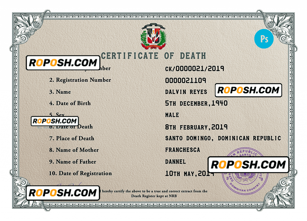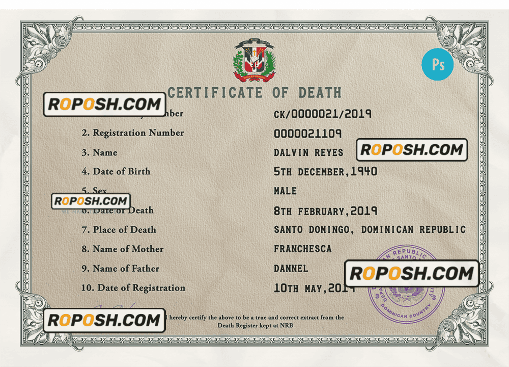 Dominican Republic vital record death certificate PSD template