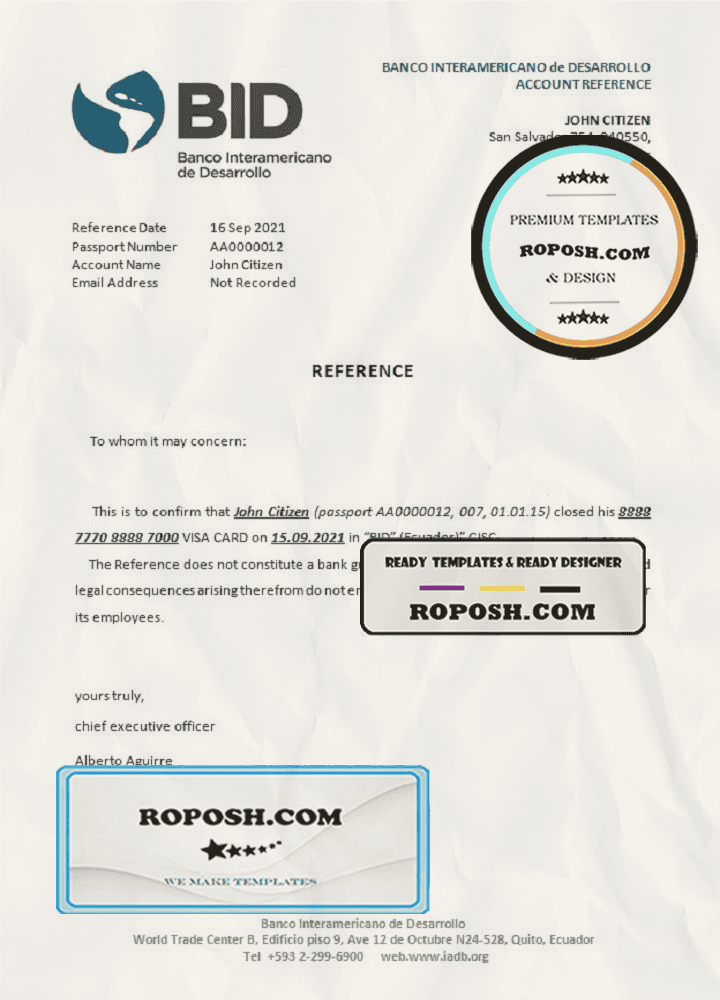Ecuador Banco Interamericano de Desarrollo (BID) bank account closure reference letter template in Word and PDF format