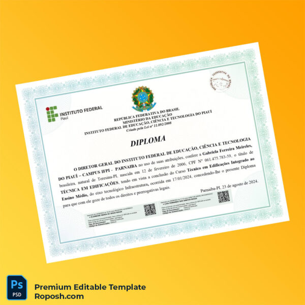 Our Brazil Instituto Federal de Educação, Ciência e Tecnologia do Piauí Technical Diploma in Civil Engineering template is designed specifically for your convenience. This fully customizable degree certificate is high-resolution, easy to edit, and perfect for creating novelty degree certificates or replacement diplomas. It ensures your graduation certificate template looks professional and ready to print.