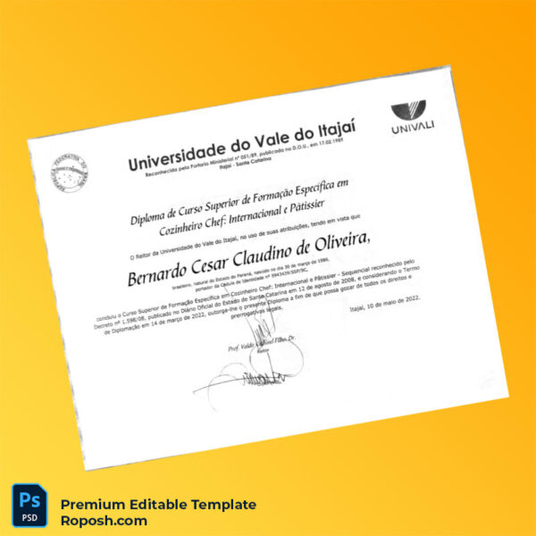 Need a reliable Brazil Universidade do Vale do Itajaí Bachelor of Culinary Arts Chef Diploma template for a quick project? Finding a high-quality, blank copy can be frustrating and time-consuming, especially when you require a professional and authentic look for your diploma or certificate needs.