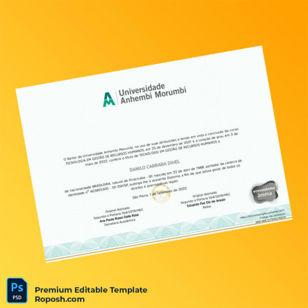 This editable diploma template provides you with a high-resolution, fully customizable degree certificate designed specifically for the Brazil University Anhembi Morumbi. Say goodbye to generic, blank university diploma templates—our product is tailored to your needs with the finest detail, including fonts, layout, and print-ready formatting. Effortlessly edit, customize, and print your blank diploma certificate with absolute confidence.