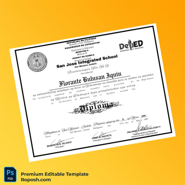 Blurry pixels, wrong fonts, or flattened layers can ruin your verification process and compromise the authenticity of your document. Many editable diploma templates fail to deliver the precision you need, costing you precious time and effort. Avoid the headache by choosing a trustworthy option like the Philippines San Jose Integrated School High School Diploma.