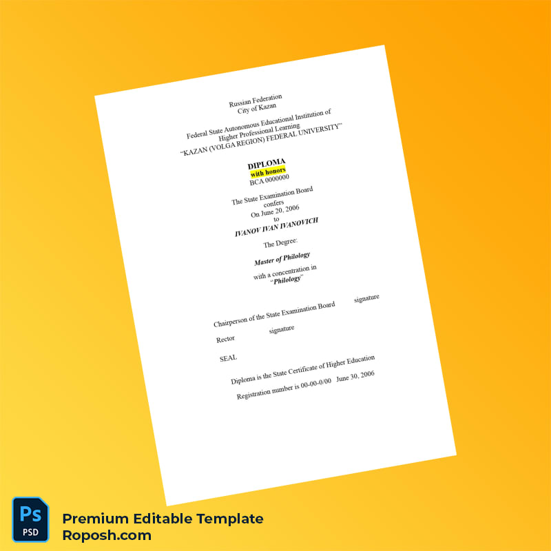 Be the first to review “Editable Diploma Template Russia Kazan (Volga Region) Federal University Master of Philology (Fast Edit) 4 Page”
