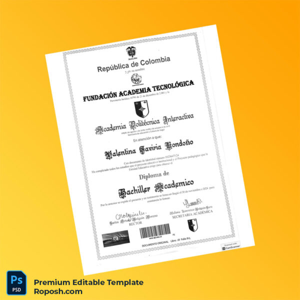 This fully editable, high-resolution Ecuador Polytechnic Academy template is designed to solve all your challenges. It supports multiple formats, allowing effortless customization for your blank university diploma template needs. The printable certificate templates come with all necessary fonts included, making it perfect as a customizable degree certificate or replacement diploma maker.