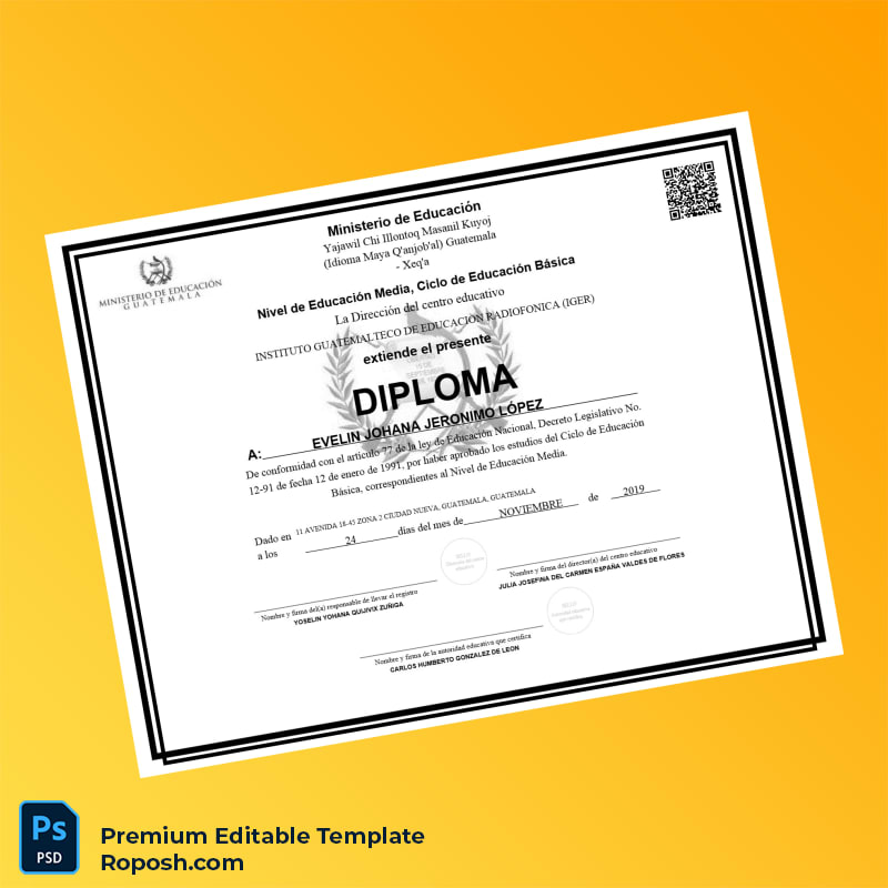 Our Guatemala Instituto Guatemalteco de Educación Radiofónica High School Diploma template offers a fully customizable, printable certificate template that ensures your graduation certificate looks authentic and professional. This is your go-to novelty degree certificate and replacement diploma maker, designed to simplify your editing process without compromising quality.