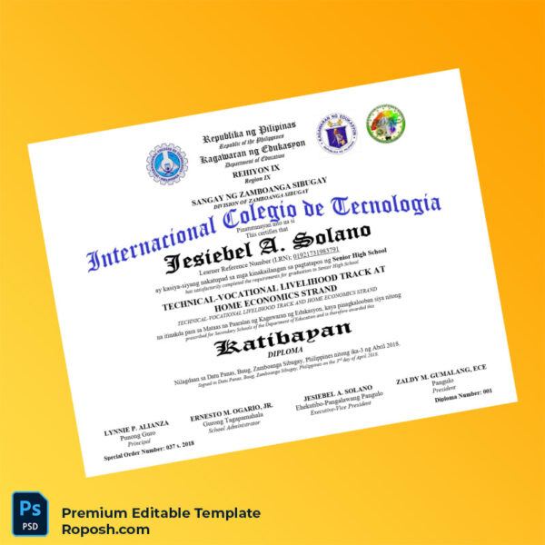 Introducing our fully editable, high-resolution Philippines Internacional Colegio de Tecnologia Senior High School Diploma template. Designed for ease of use, it offers a seamless customization experience with layered files optimized for editing degree text, names, and signatures. This printable certificate template is perfect as a novelty degree certificate or a replacement diploma maker, ensuring you get a professional result every time.