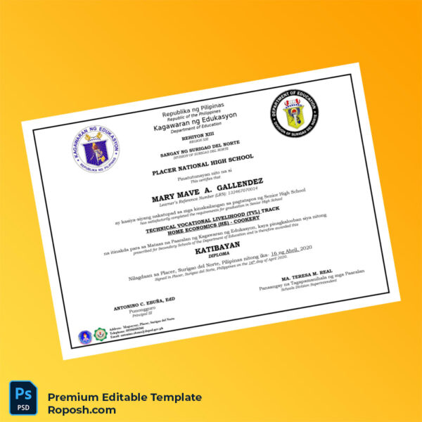 Discover the Philippines Placer National High School High School Diploma – a fully customizable, high-resolution, and easy-to-edit diploma template designed for your convenience. This novelty degree certificate is perfect whether you need a replacement diploma maker or a blank university diploma template to customize quickly and print immediately.