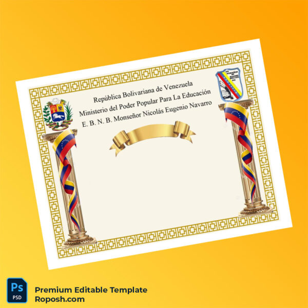 Explore our Venezuela E. B. N. B. Monseñor Nicolás Eugenio Navarro High School Diploma template for a trustworthy, editable diploma solution compatible with common editing tools and printable with sharp clarity.