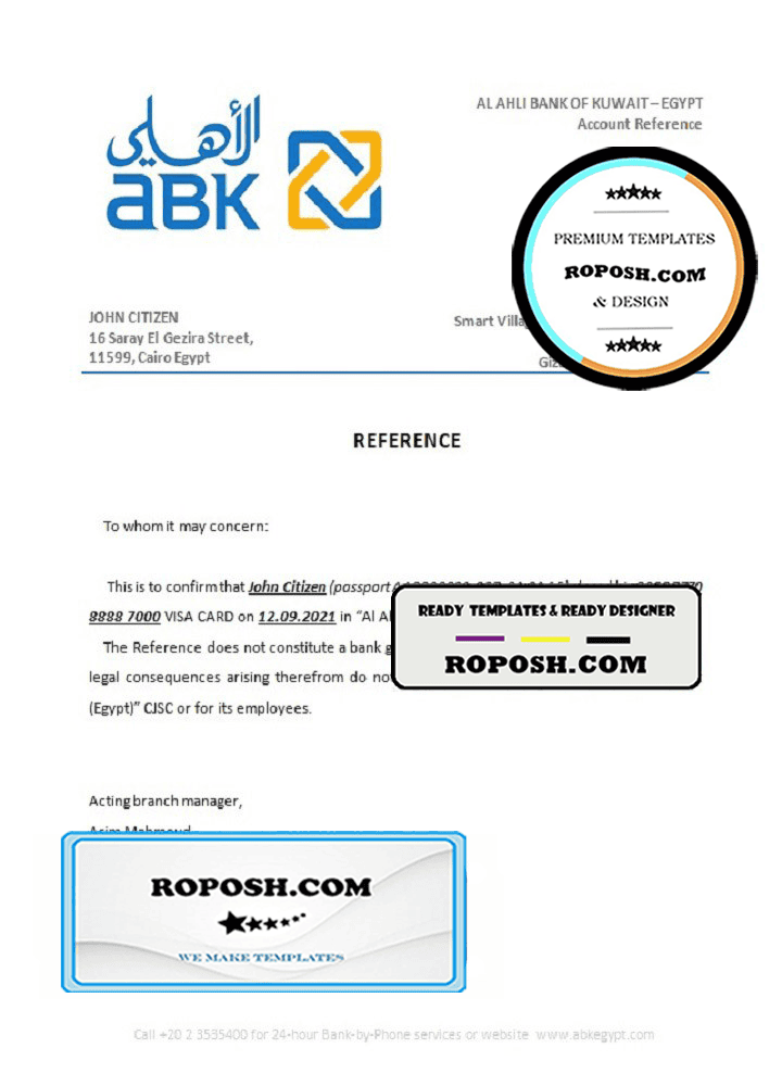 Egypt Al Ahli Bank of Kuwait bank account closure reference letter template in Word and PDF format