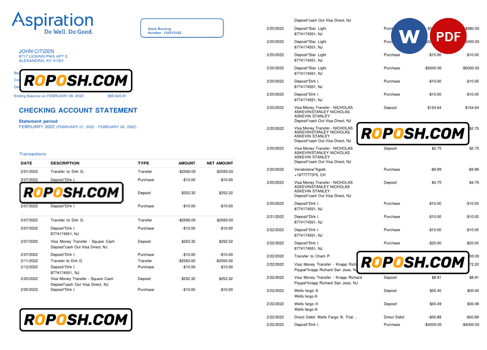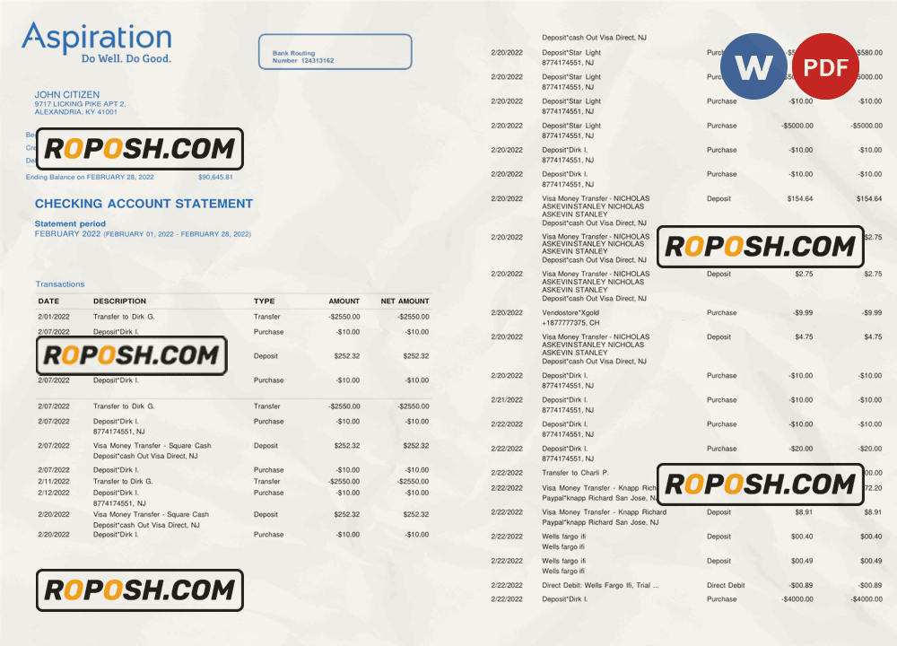 Get your fully editable Egypt Aspiration Bank Statement Template from Roposh today. Perfect for creating realistic bank statements for educational or theatrical purposes. We also offer a variety of other templates including editable credit cards, ID cards, drivers licenses, and utility bills.