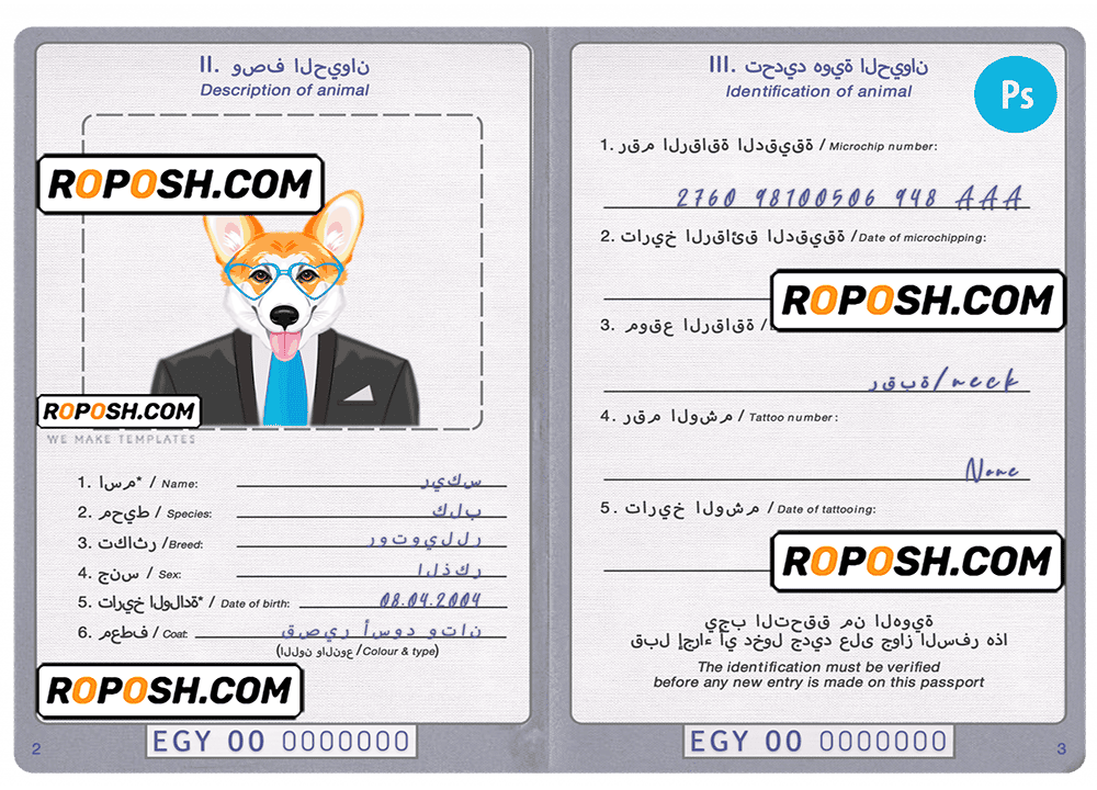 Egypt dog (animal, pet) passport PSD template, is designed to look and feel like real documents. Each template is carefully crafted to include all the necessary details, such as your pet’s name, breed, date of birth, and microchip information. With our fillable cat or dog passport templates, you can quickly and easily create a editable pet passport that meets all the requirements for international travel.