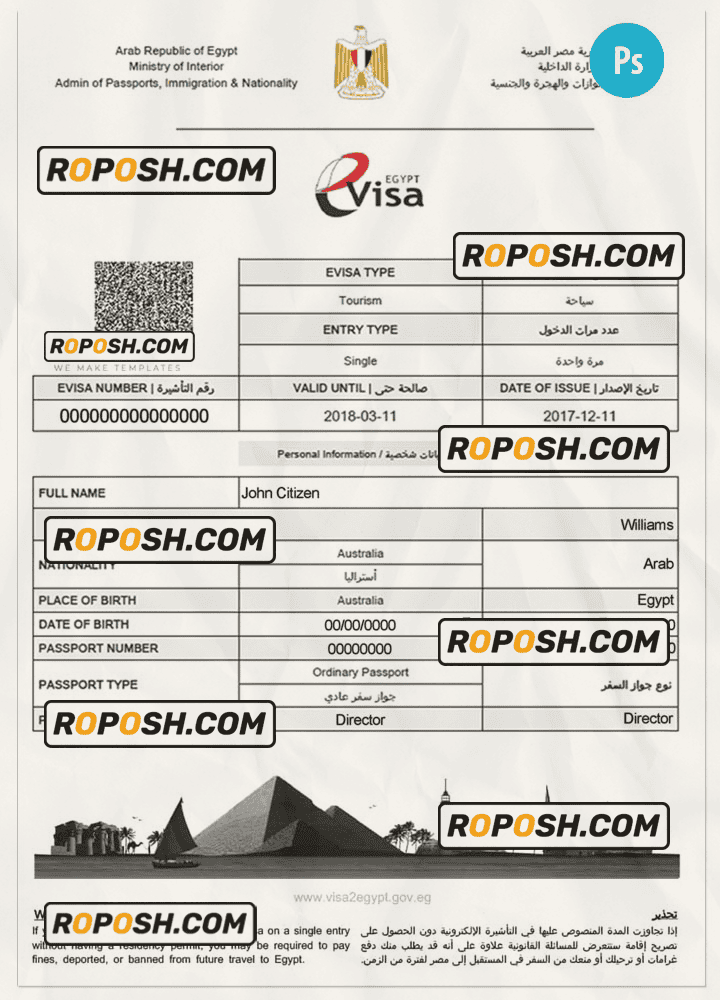 EGYPT electronic entry visa template psd. Buy Customizable Travel Visa Template with high quality and enjoy its unique features such as easy to customize, Layer based, fonts included sample. you can edit this template and  put any name, address, license number, Id number, birth date, height, weight, expire date, change photos etc. This Photoshop template is a layer based psd file and it’s easy to Editing.To modify this photoshop template file you will need a Photo editing software such as Adobe Photoshop No need to be expert on editing software like adobe Photoshop. However, You just have to basic knowledge on adobe photoshop, to edit this template. Never used low quality template. Your account may be suspended. Also, if you’re looking for an editable SSN template, Roposh is by your side so you can get it easily and even for free.