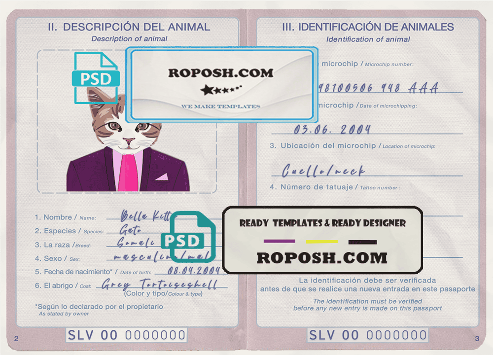 El Salvador cat (animal, pet) passport PSD template, is your one-stop-shop for realistic and editable editable pet identity cards and passports. We specialize in creating high-quality, customizable editable pet passports and identity cards for dogs, cats, and other furry friends.