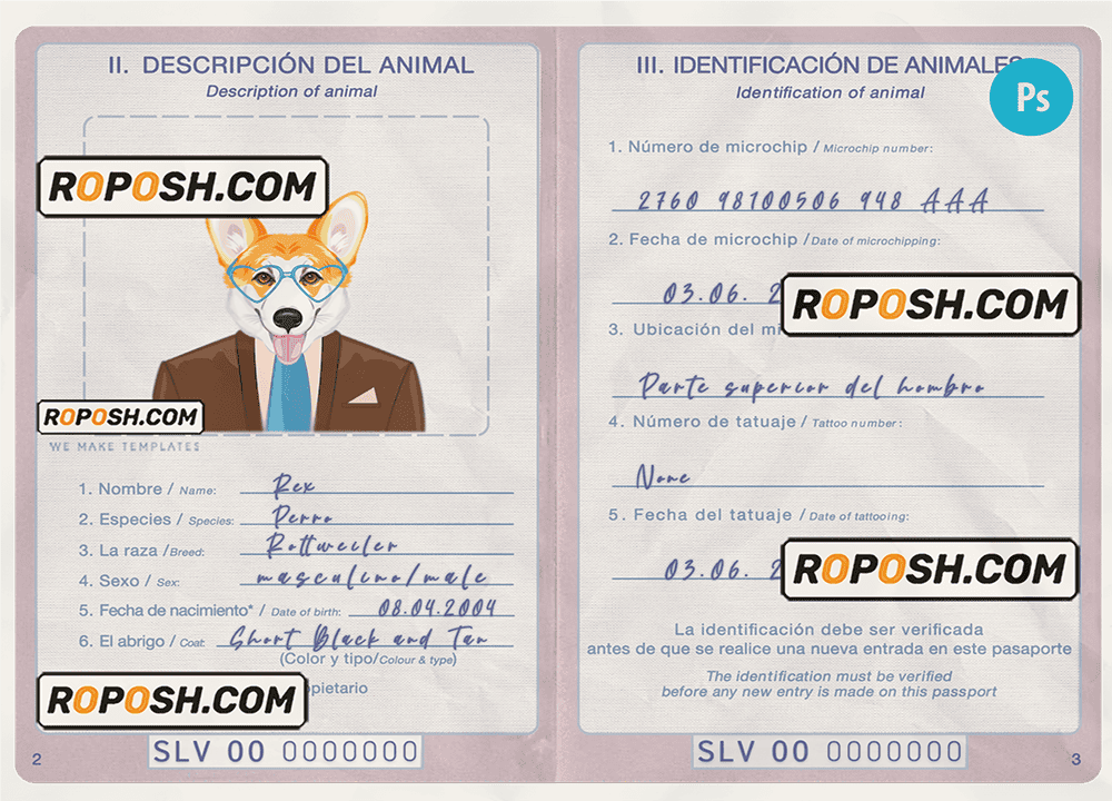 El Salvador dog (animal, pet) passport PSD template, is designed to look and feel like real documents. Each template is carefully crafted to include all the necessary details, such as your pet’s name, breed, date of birth, and microchip information. With our fillable cat or dog passport templates, you can quickly and easily create a editable pet passport that meets all the requirements for international travel.