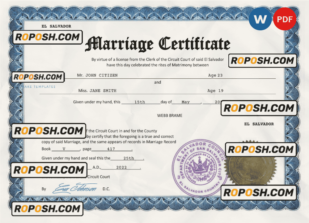 Get your printable El Salvador marriage certificate templates now and join our growing list of satisfied customers!