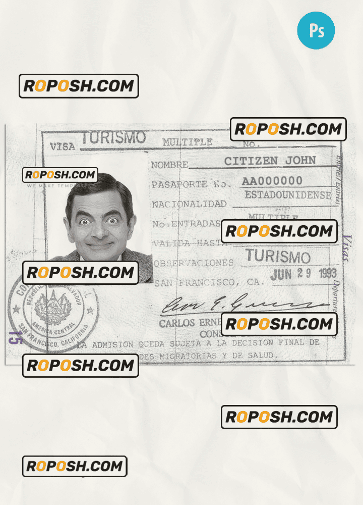 EL SALVADOR travel visa template psd. Buy Customizable Travel Visa Template with high quality and enjoy its unique features such as easy to customize, Layer based, fonts included sample. you can edit this template and put any name, address, license number, Id number, birth date, height, weight, expire date, change photos etc. This Photoshop template is a layer based psd file and it’s easy to Editing.To modify this photoshop template file you will need a Photo editing software such as Adobe Photoshop No need to be expert on editing software like adobe Photoshop. However, You just have to basic knowledge on adobe photoshop, to edit this template. Never used low quality template. Your account may be suspended. Also, if you’re looking for an editable SSN template, Roposh is by your side so you can get it easily and even for free.