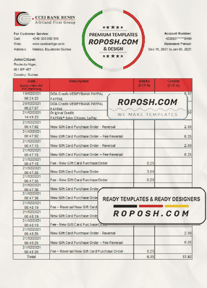 No need for Photoshop! Avoid low-quality templates that could risk your account suspension. Get our fully editable Equatorial Guinea CCEI Bank Benin bank statement template from Roposh and create your own novelty documents. This template is beneficial if your bank statement is expired, stolen, or unavailable. We also offer editable credit card, ID card PSD templates, bank statement PSD templates, driver’s license PSD templates, and printable editable blank utility bill templates.