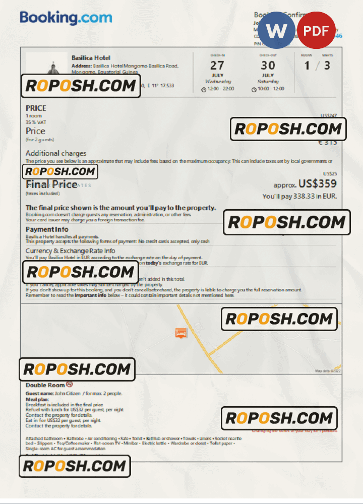 This Blank Equatorial Guinea hotel booking confirmation PDF Template is perfect for a variety of uses, such as Visa applications, proof of accommodation, showing your expenses, and more. You can even use it to create realistic copies of your credit card for novelty documents. We have a variety of other templates available, including passport templates, ID card templates, reciept template, and more.