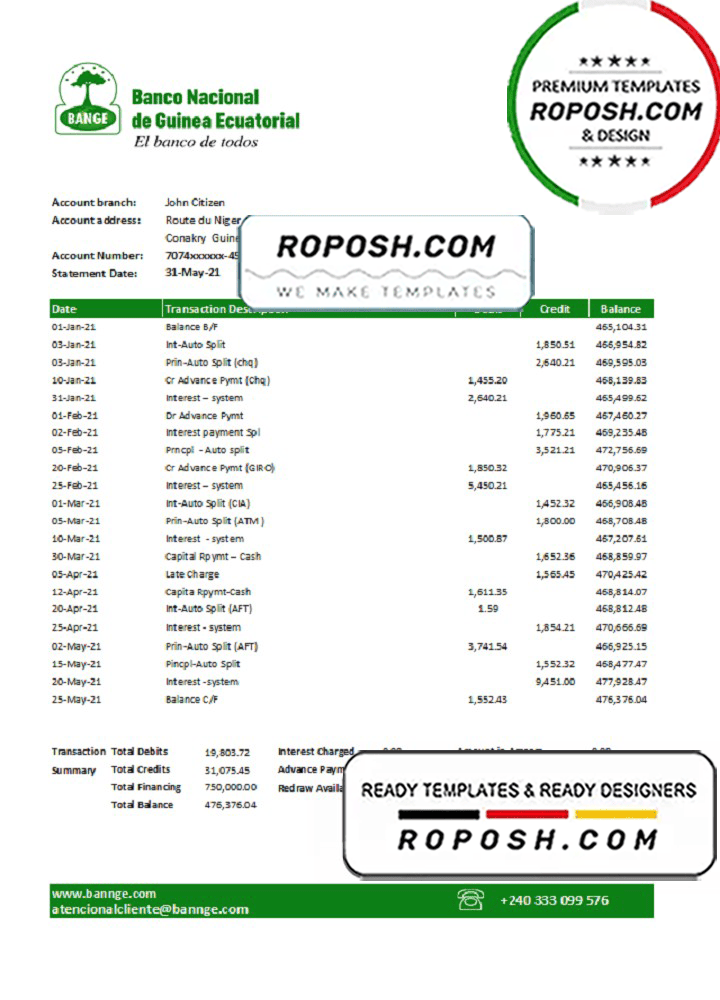 Get your fully editable Equatorial Guinea The National Bank of Equatorial Guinea Bank Statement Word Template from Roposh and customize it with your own information to create realistic novelty documents. This is especially useful if your bank statement is expired, stolen, or unavailable. We also offer editable credit card templates, ID card PSD templates, bank statement PSD templates, driver’s license PSD templates, and printable editable blank utility bill templates.
