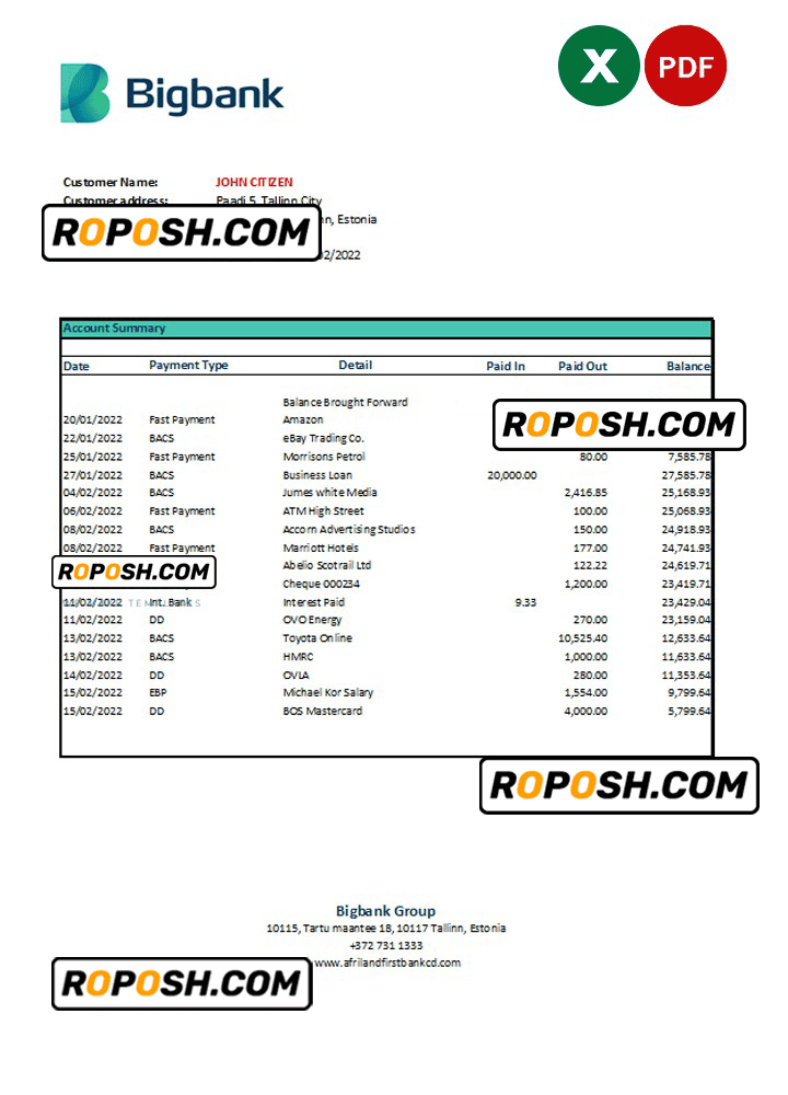 Grab now fully editable Estonia Bigbank bank statement Excel Template from our website Roposh and put your own info to create Realistic Bank Statement template Excel and ready your own novelty documents. It’ll be so beneficial if your Bank Statement is expired, stolen or not available.We also have editable credit card, ID Card psd template, Bank Statement psd template, drivers license psd template & printable editable blank utility bill template.