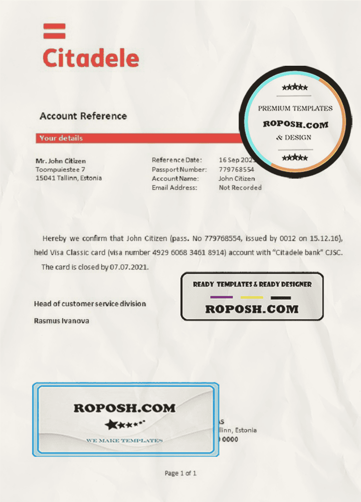 Estonia Citadele banka Eesti filiaal AS template of bank account closure reference letter, Word and PDF format (.doc and .pdf)