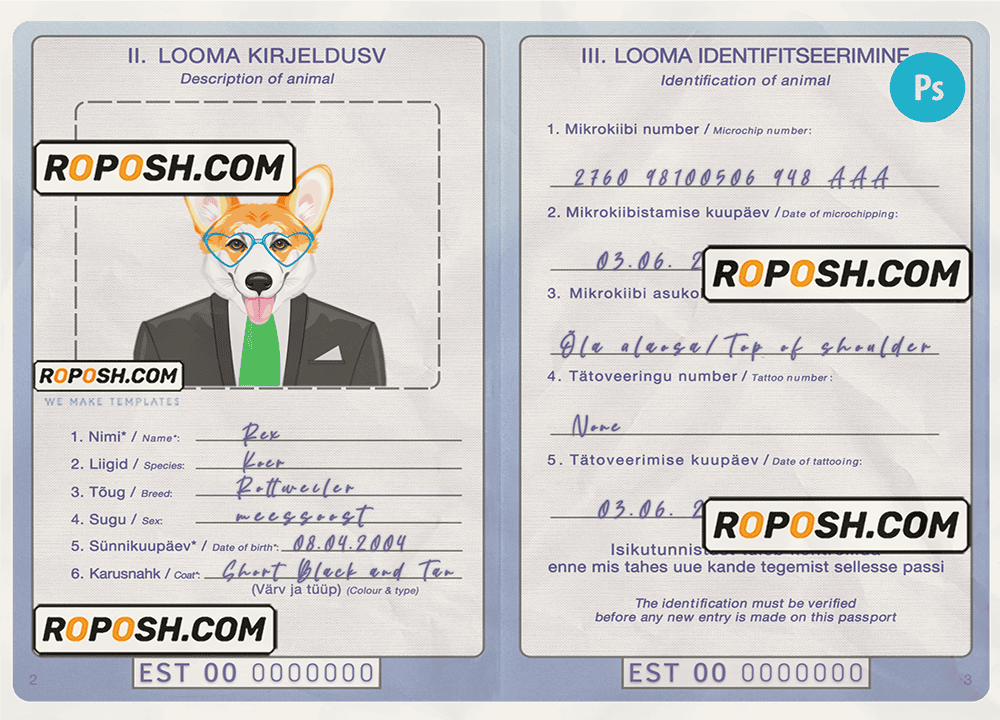 Estonia dog (animal, pet) passport PSD template, is designed to look and feel like real documents. Each template is carefully crafted to include all the necessary details, such as your pet’s name, breed, date of birth, and microchip information. With our fillable cat or dog passport templates, you can quickly and easily create a editable pet passport that meets all the requirements for international travel.