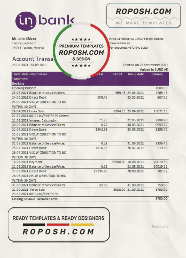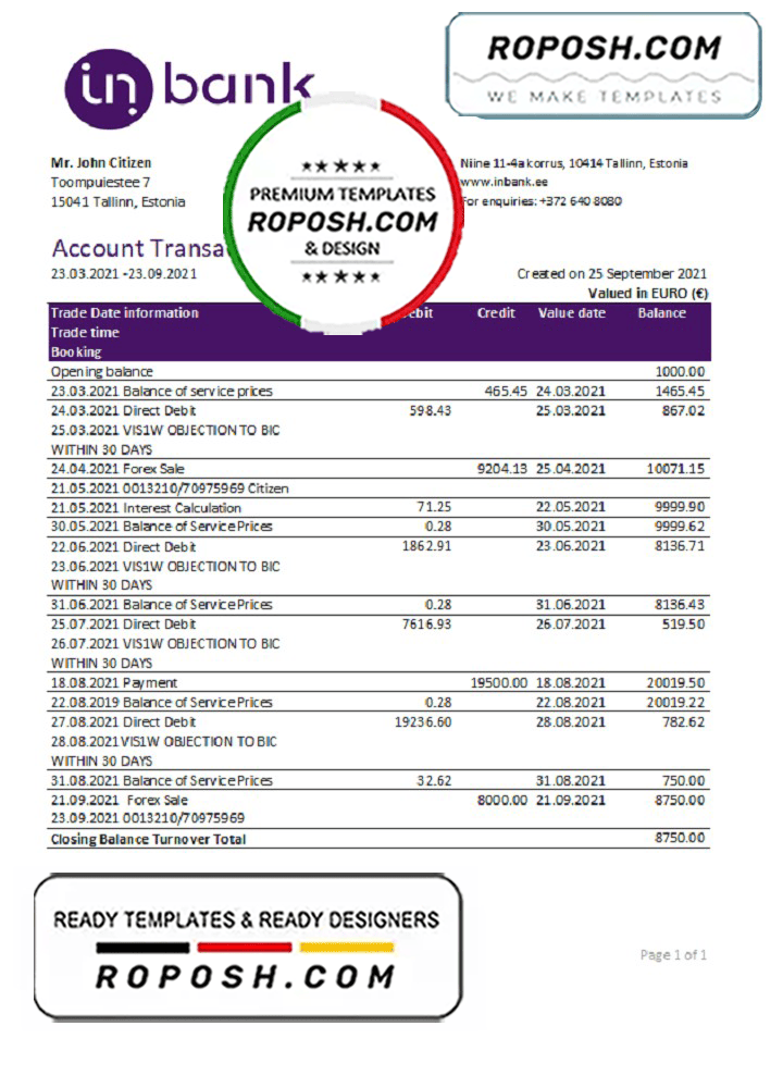 Grab now fully editable Estonia Inbank bank statement easy to fill Excel Template from our website Roposh and put your own info to create Realistic Bank Statement template Excel and ready your own novelty documents. It’ll be so beneficial if your Bank Statement is expired, stolen or not available.We also have editable credit card, ID Card psd template, Bank Statement psd template, drivers license psd template & printable editable blank utility bill template.
