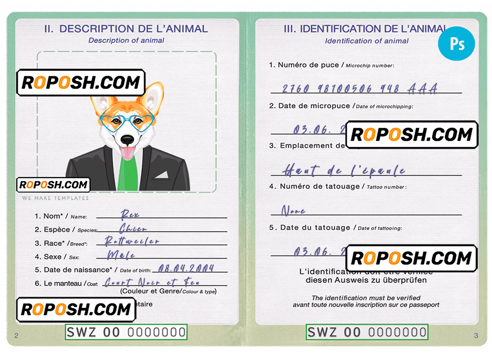 Eswatini (Swaziland) dog (animal, pet) passport PSD template, is your one-stop-shop for realistic and editable editable pet identity cards and passports. We specialize in creating high-quality, customizable editable pet passports and identity cards for dogs, cats, and other furry friends.