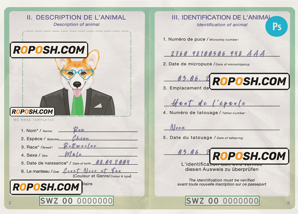 Eswatini (Swaziland) dog (animal, pet) passport PSD template, is designed to look and feel like real documents. Each template is carefully crafted to include all the necessary details, such as your pet’s name, breed, date of birth, and microchip information. With our fillable cat or dog passport templates, you can quickly and easily create a editable pet passport that meets all the requirements for international travel.