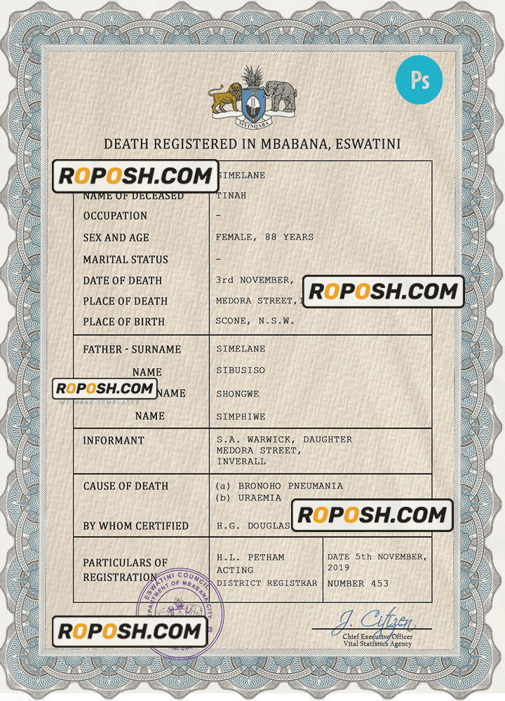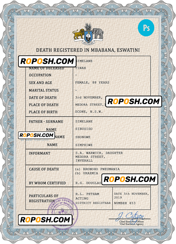 Explore a vast collection of legitimate-looking editable death certificates for several countries worldwide. The editable Eswatini death certificates offers easy access to obtaining the required document for a variety of purposes, predominantly claiming life insurance, pensions, and resolving estates.
