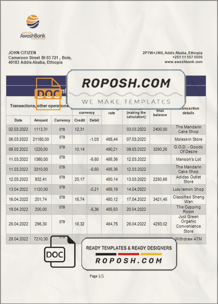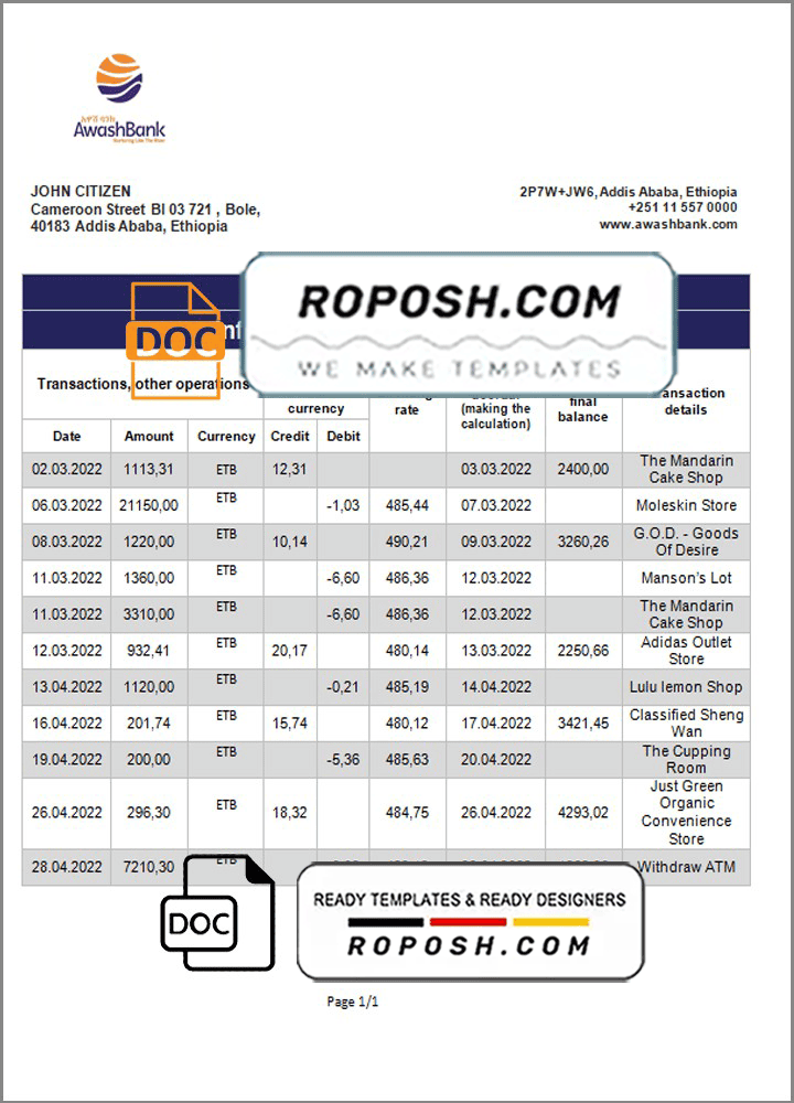 Grab now fully editable Ethiopia Awash proof of address bank statement Word Template from our website Roposh and put your own info to create Realistic Bank Statement Word template and ready your own novelty documents. It’ll be so beneficial if your Bank Statement is expired, stolen or not available.We also have editable credit card, ID Card psd template, Bank Statement psd template, drivers license psd template & printable editable blank utility bill template.