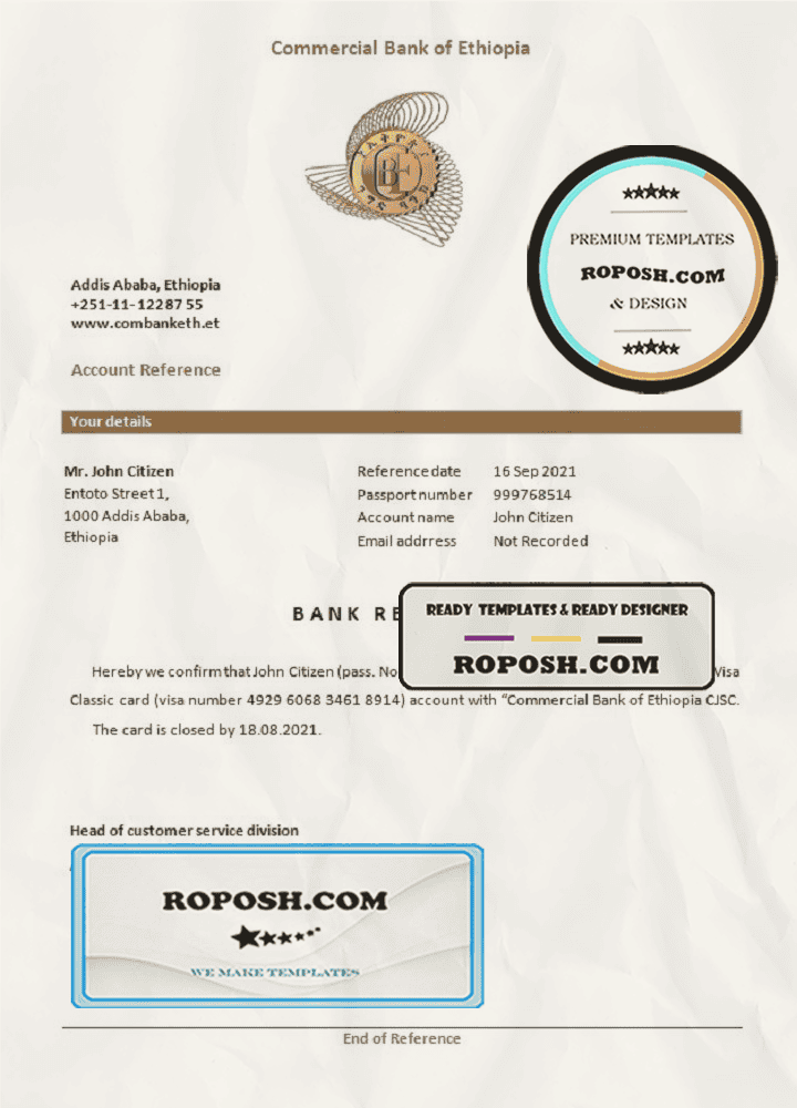 Ethiopia Commercial Bank bank account closure reference letter, Word and PDF format (.doc and .pdf)