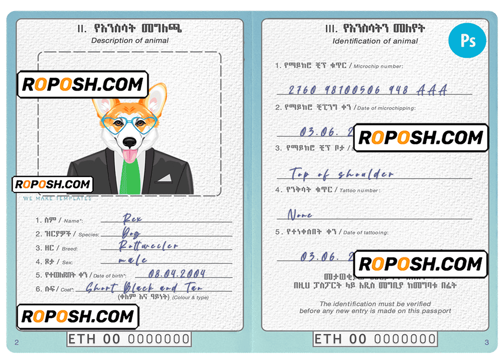 Ethiopia dog (animal, pet) passport PSD template, is designed to look and feel like real documents. Each template is carefully crafted to include all the necessary details, such as your pet’s name, breed, date of birth, and microchip information. With our fillable cat or dog passport templates, you can quickly and easily create a editable pet passport that meets all the requirements for international travel.