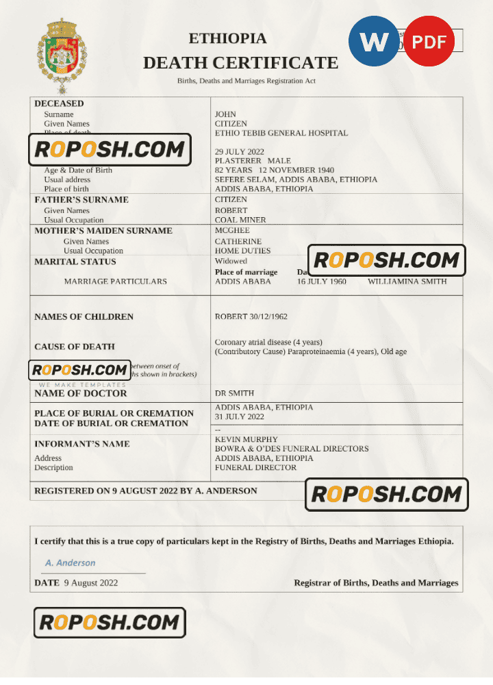 Explore a vast collection of legitimate-looking editable death certificates for several countries worldwide. The editable Ethiopia death certificates offers easy access to obtaining the required document for a variety of purposes, predominantly claiming life insurance, pensions, and resolving estates.