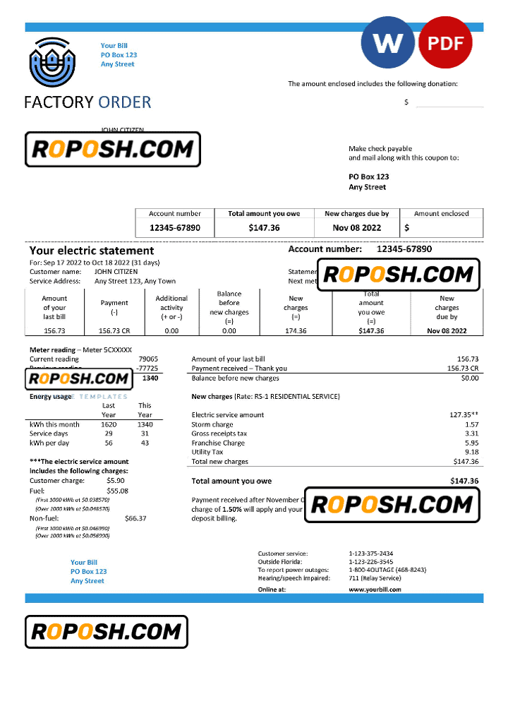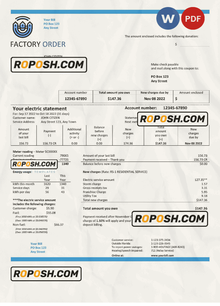 Get your blank universal multipurpose utility bill template from Roposh today. Customize it with your information to create a editable utility bill for proof of address or other novelty documents. Ideal for situations where your utility bill is expired, stolen, or unavailable. Explore our range of templates, including passport PSD templates, ID card PSD templates, bank statement PSD templates, driver’s license PSD templates, and utility bill PSD templates.