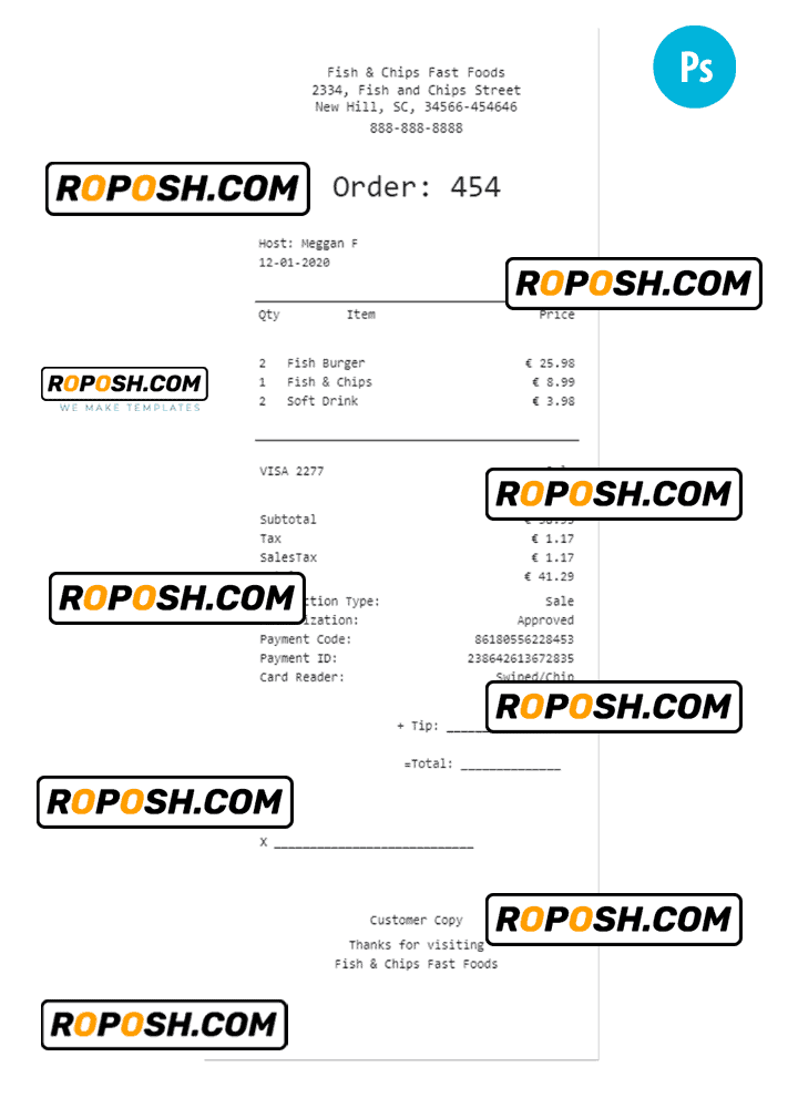 A FAST FOOD payment receipt in psd format is a document that can prove a successful transaction. It includes the purchase details such as the date of the transaction, the amount paid, a description of goods or services purchased, and a unique receipt number.