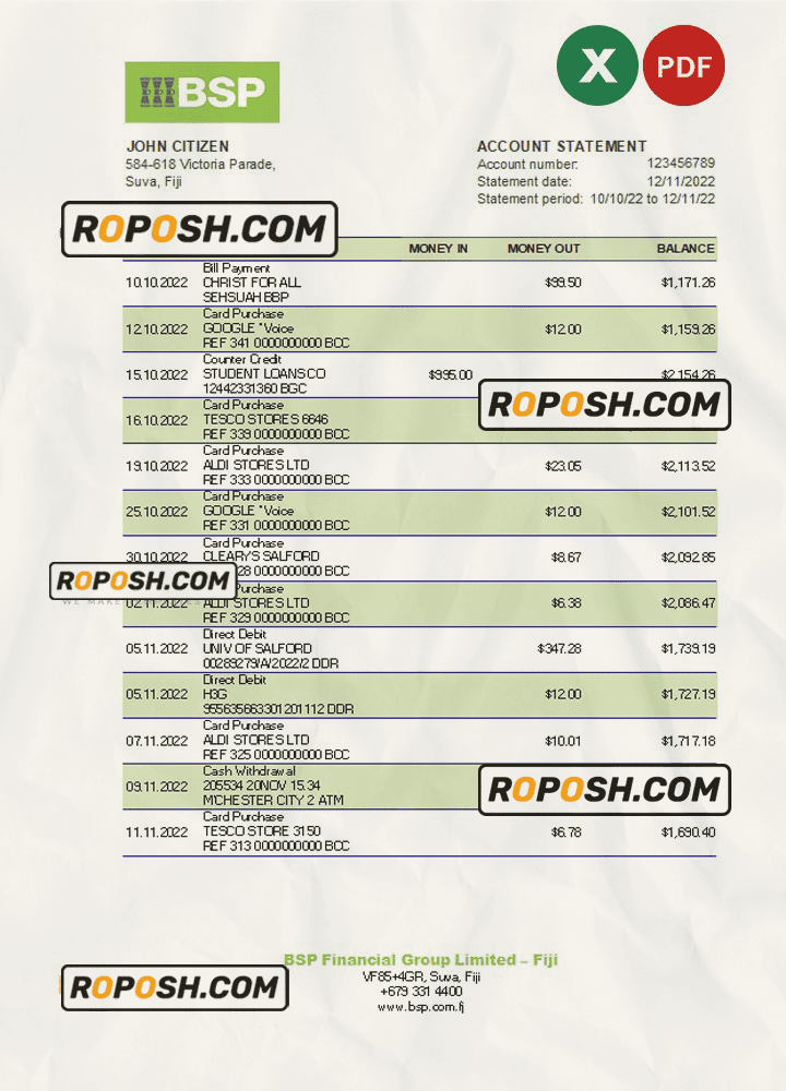 Fiji Bank of South Pacific bank statement Template in Excel an PDF format use for :