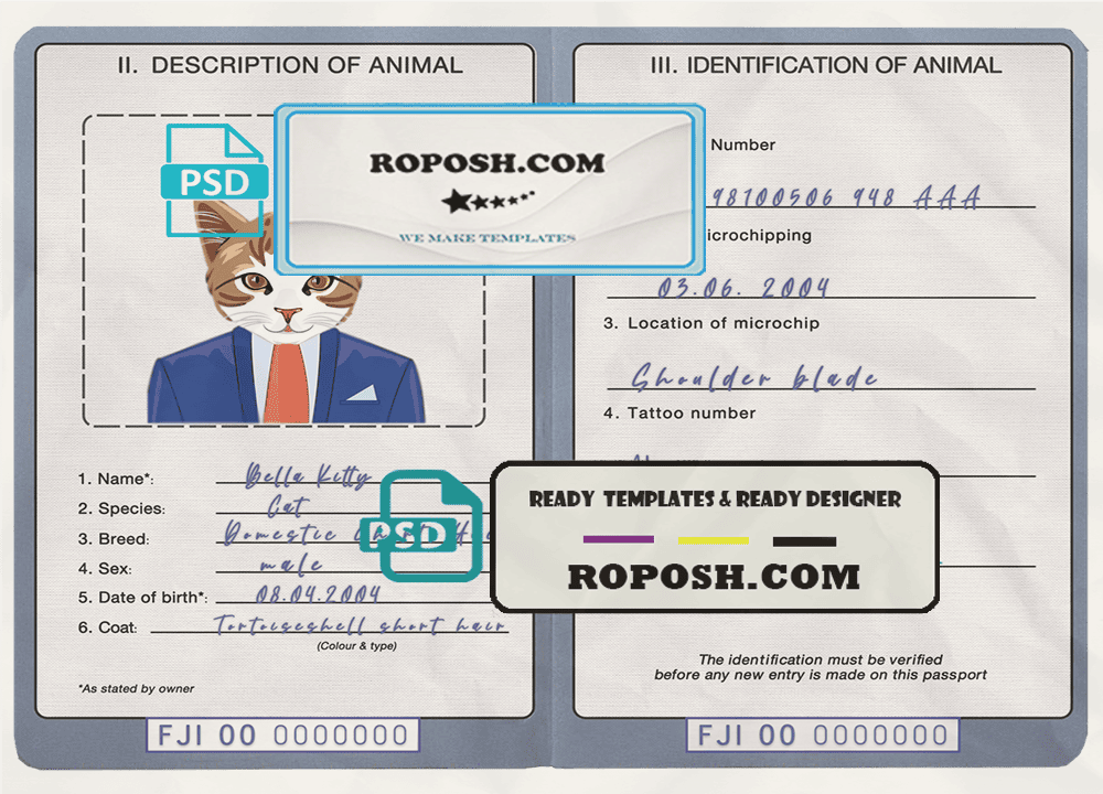 Fiji cat (animal, pet) passport PSD template, is your one-stop-shop for realistic and editable editable pet identity cards and passports. We specialize in creating high-quality, customizable editable pet passports and identity cards for dogs, cats, and other furry friends.