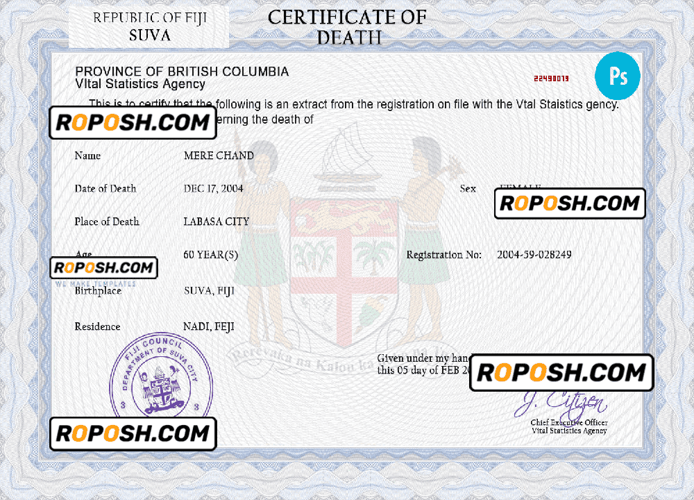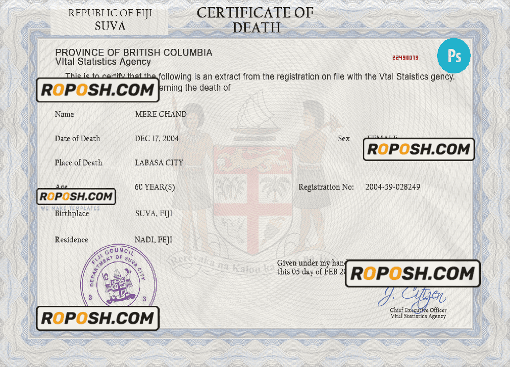 Be the first to review “Fiji death certificate PSD template, completely editable”