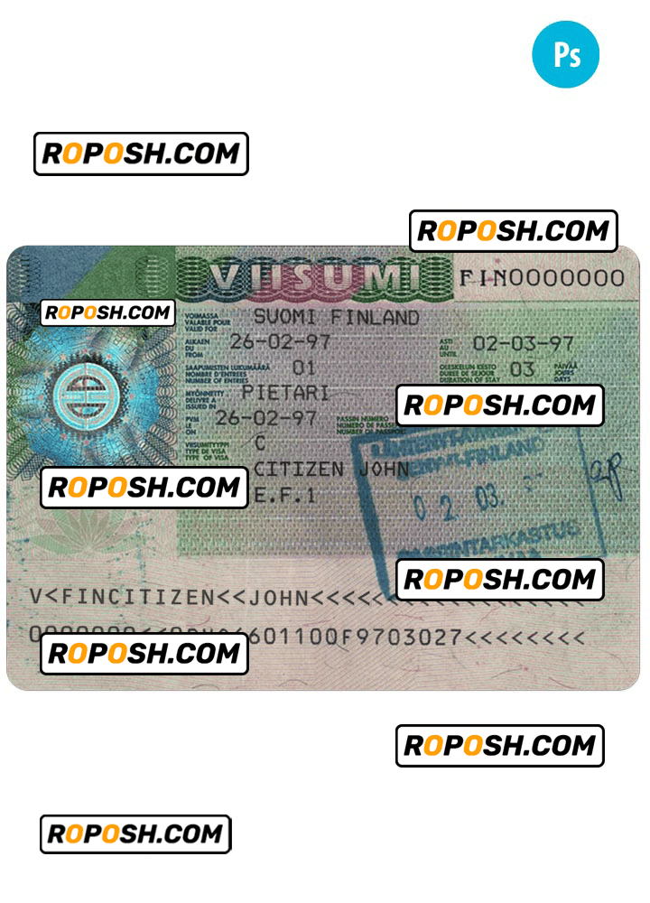 FINLAND entry visa template psd. Buy Customizable Travel Visa Template with high quality and enjoy its unique features such as easy to customize, Layer based, fonts included sample. you can edit this template and put any name, address, license number, Id number, birth date, height, weight, expire date, change photos etc. This Photoshop template is a layer based psd file and it’s easy to Editing.To modify this photoshop template file you will need a Photo editing software such as Adobe Photoshop No need to be expert on editing software like adobe Photoshop. However, You just have to basic knowledge on adobe photoshop, to edit this template. Never used low quality template. Your account may be suspended. Also, if you’re looking for an editable SSN template, Roposh is by your side so you can get it easily and even for free.