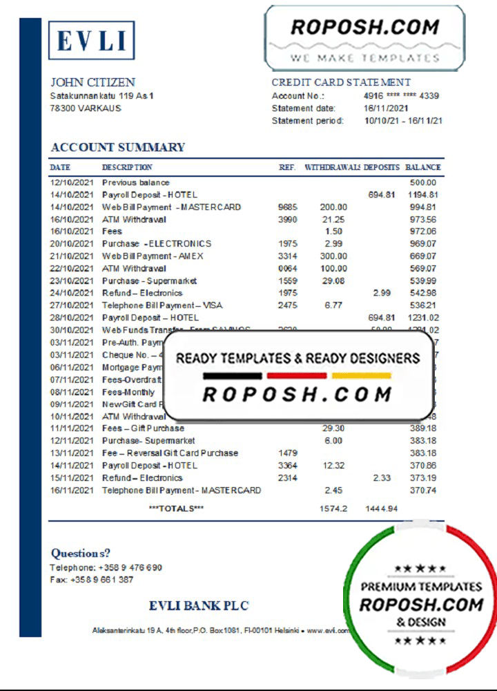 Get your fully editable Finland Evli Bank PLC bank statement template from Roposh today. Perfect for creating novelty documents if your bank statement is expired, stolen, or unavailable. We also offer editable credit card templates, ID card templates, bank statement PSD templates, driver’s license templates, and printable editable blank utility bill templates.