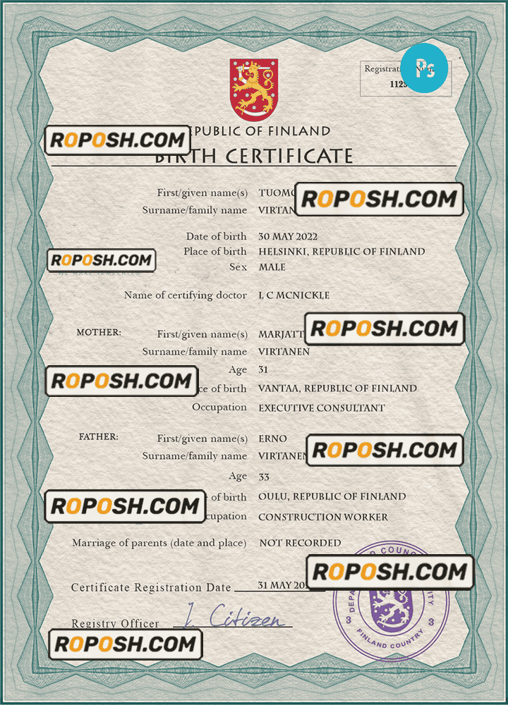 roposh offers hundreds of high-quality, realistic, and customizable birth certificates. The Finland birth certificate template is fully fillable, and you can complete it with any information you wish, such as name, surname, birth date, place of birth and etc. Whether you are using our PSD template (a layer-based adobe photoshop file) or our PDF template (a Microsoft Office editable file) you will get a package with fonts included instantly. No need to worry even if you can’t generate realistic birth proof yourself, we offer reliable editing service with your desired information for an extra charge. Also, we are always online and here to help you experience a confident purchase. So, reach out!