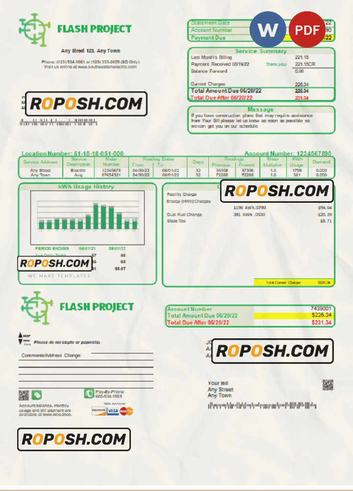 Get your hands on our blank Universal Multipurpose Utility Bill Template from Roposh. Customize it with your information to create a convincing editable utility bill for proof of address. Ideal for situations where your utility bill is expired, stolen, or unavailable. We also offer a variety of other templates, including passport PSD templates, ID card PSD templates, Bank Statement PSD templates, driver’s license PSD templates, and Utility bill PSD templates.