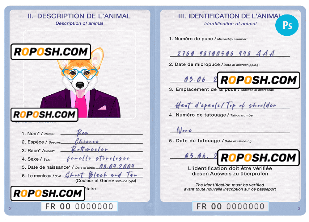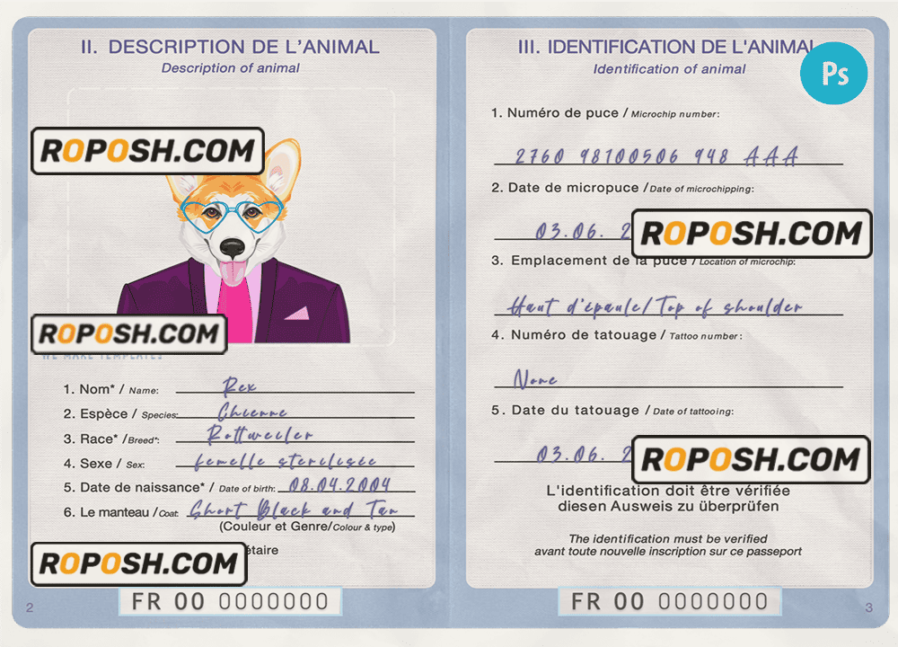 France dog (animal, pet) passport PSD template, is your one-stop-shop for realistic and editable editable pet identity cards and passports. We specialize in creating high-quality, customizable editable pet passports and identity cards for dogs, cats, and other furry friends.