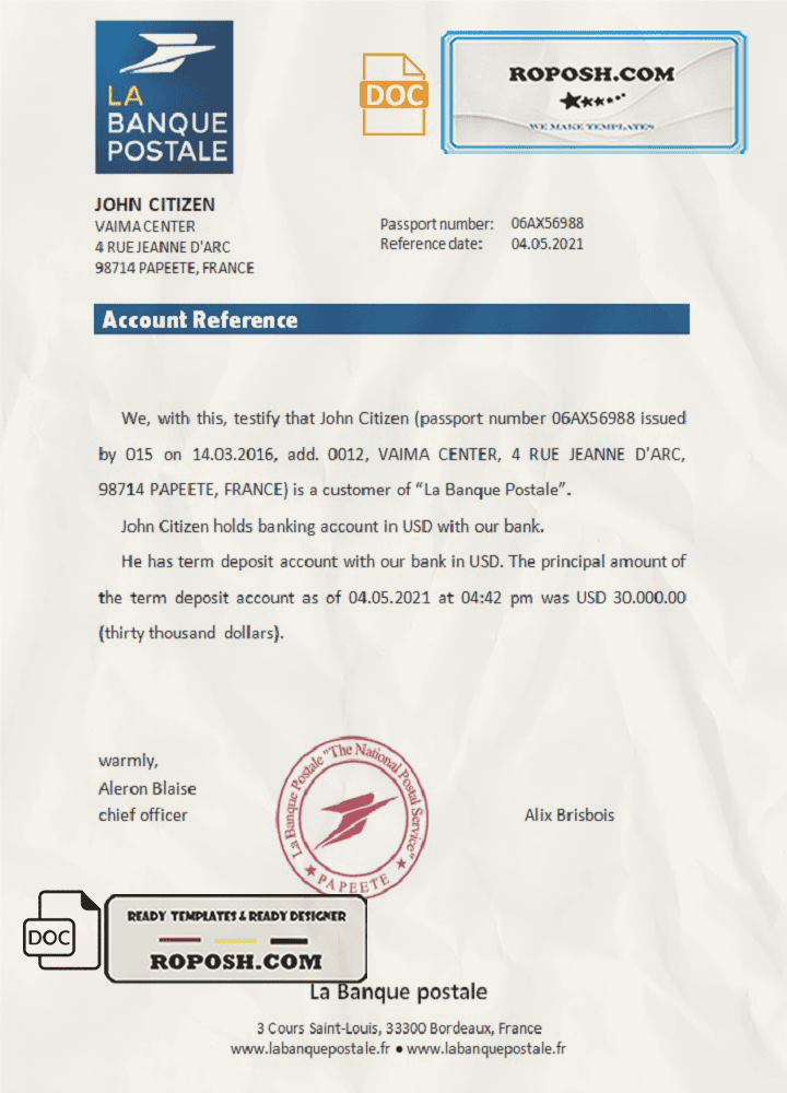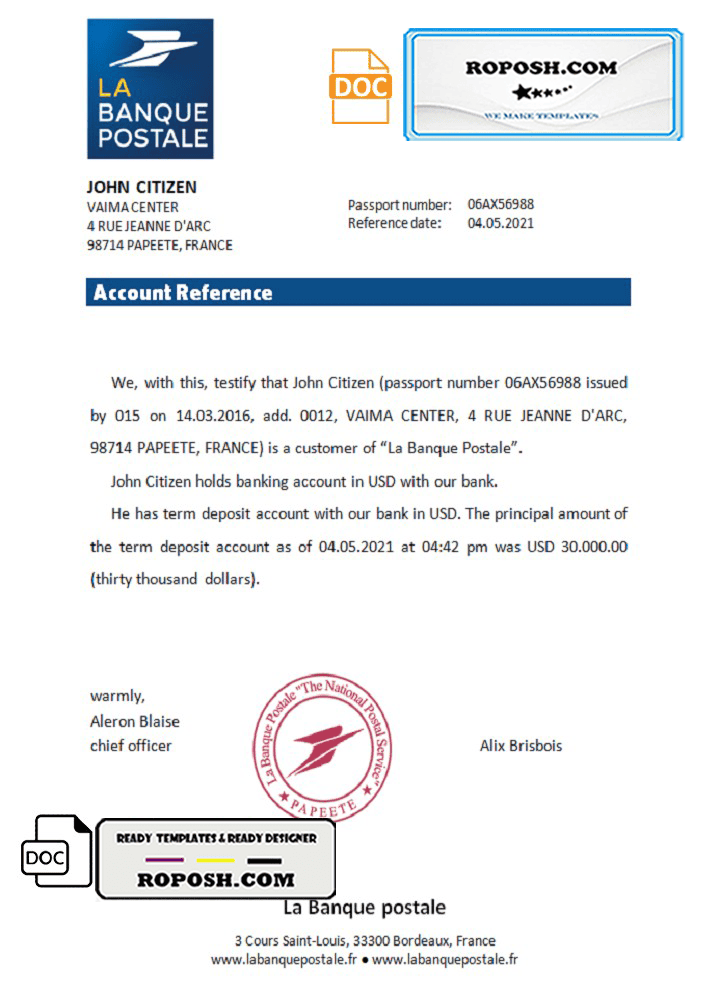 France La Banque Postale bank account reference letter template in Word and PDF format