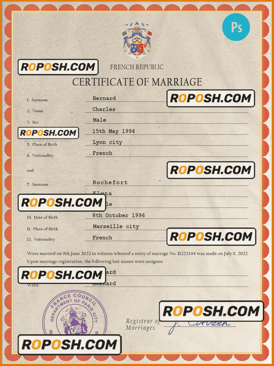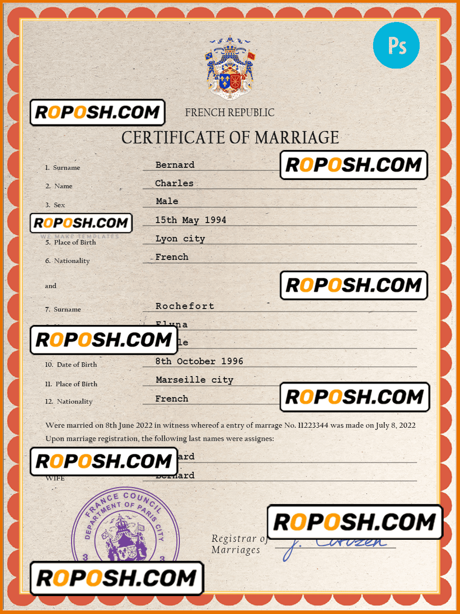 Be the first to review “France marriage certificate PSD template, completely editable”