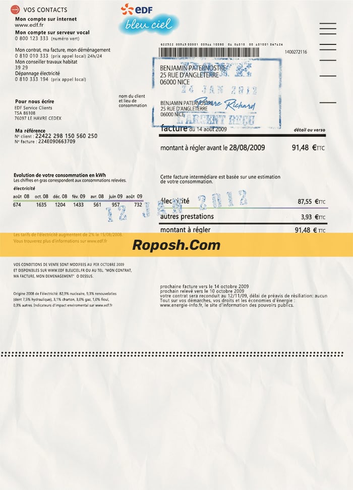 Get your hands on our fully editable France utility bill PSD template from Roposh. Customize it with your own information to create a realistic editable utility bill. Ideal for situations where your ID card is expired, stolen, or unavailable. We also offer a variety of other templates, including passport PSD templates, ID card PSD templates, bank statement PSD templates, driver’s license PSD templates, and utility bill PSD templates.