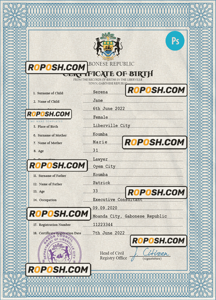 roposh offers hundreds of high-quality, realistic, and customizable birth certificates. The Gabon birth certificate template is fully fillable, and you can complete it with any information you wish, such as name, surname, birth date, place of birth and etc. Whether you are using our PSD template (a layer-based adobe photoshop file) or our PDF template (a Microsoft Office editable file) you will get a package with fonts included instantly. No need to worry even if you can’t generate realistic birth proof yourself, we offer reliable editing service with your desired information for an extra charge. Also, we are always online and here to help you experience a confident purchase. So, reach out!